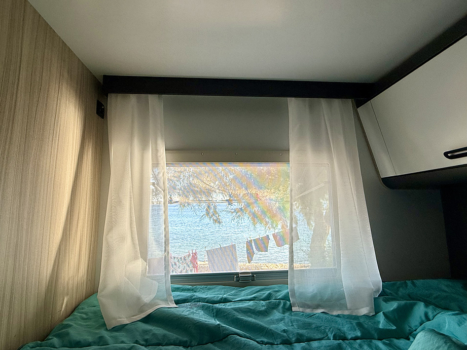 Der Sun Living S 72 SP erwies sich als perfekt für uns. Dieses teilintegrierte Wohnmobil ist 7,20 Meter lang, 2,30 Meter breit und 2,87 Meter hoch. Mein Partner und ich schliefen im hinteren Querbett, wo wir viel Platz hatten. Unsere Jungs, die wenige Wochen später ihren dreizehnten und sechzehnten Geburtstag feierten, teilten sich das Klappbett. Die beiden, die wie Unkraut wachsen, hatten etwas weniger Platz als wir. Trotzdem hat es gut funktioniert. Das Einzige, was wir in diesem Urlaub wirklich vermisst haben, war eine Klimaanlage. In Griechenland war es extrem heiß, sodass die Temperatur im Wohnmobil nachts erheblich anstieg, obwohl wir die Dachluken und Fenster rechtzeitig geschlossen und geöffnet hatten. Glücklicherweise sorgte ein mitgebrachter Ventilator für etwas Abkühlung. Und dank der Klimaanlage in der Kabine blieb es tagsüber während der Fahrt schön kühl.
